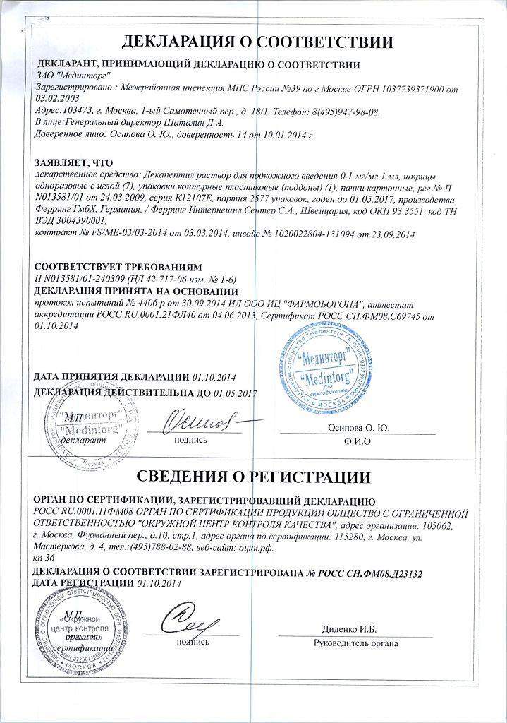Применение. Обычная начальная доза составляет 0,5 мг один раз в день в течение 7 дней, затем следует поддерживающая доза 0,1 мг один раз в день.. При подготовке к радикальной операции при раке простаты использовать медикамент следует не менее 12 недель до операции. У женщин из-за вероятности остеопороза Декапептил следует вводить не более шести месяцев.