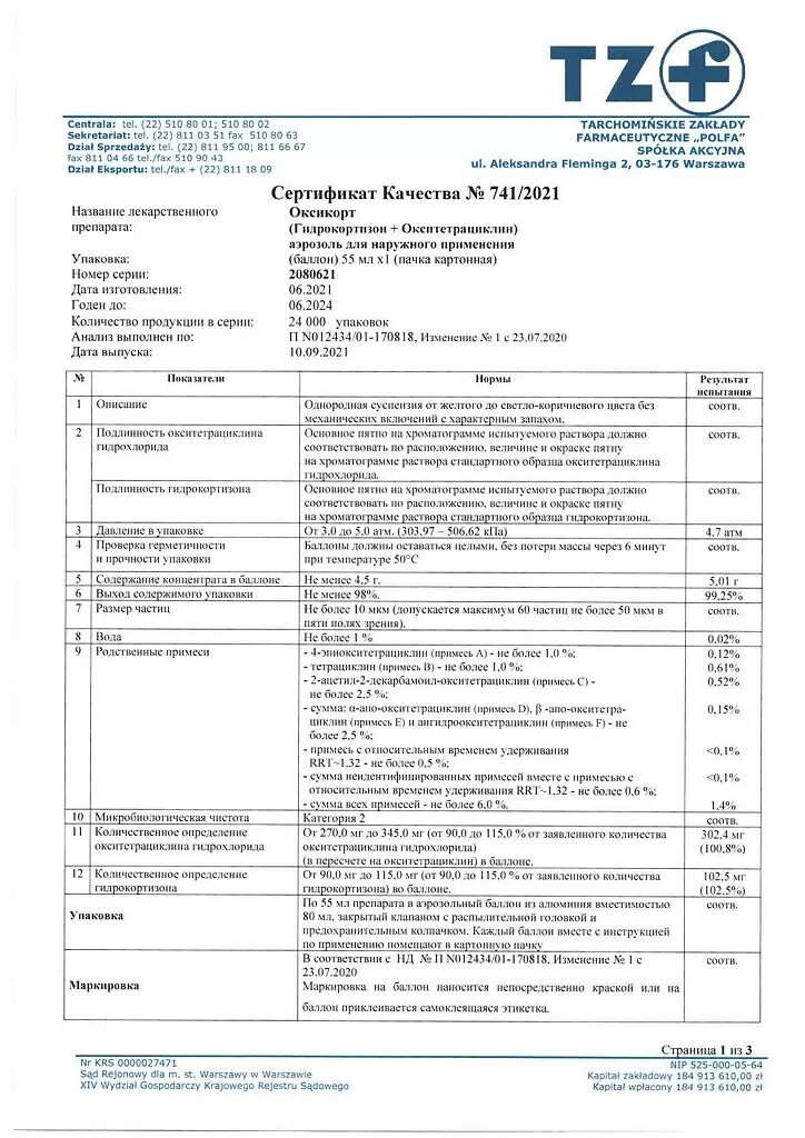Оксикорт аэрозоль — препарат, применяемый в дерматологии для местного лечения воспалений кожи. Обладает бактериостатическими, противовоспалительными, антиэкссудативными и противоаллергическими свойствами. Oxycort аэрозоль доступен по рецепту.