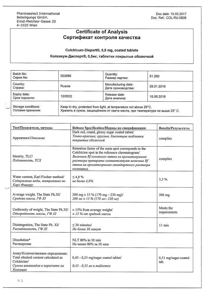 1 таблетка Колхикум-Дисперт содержит: сухой экстракт семян безвременника осеннего 15.6 мг, что соответствует содержанию суммы алкалоидов в пересчете на колхицин 500 мкг.