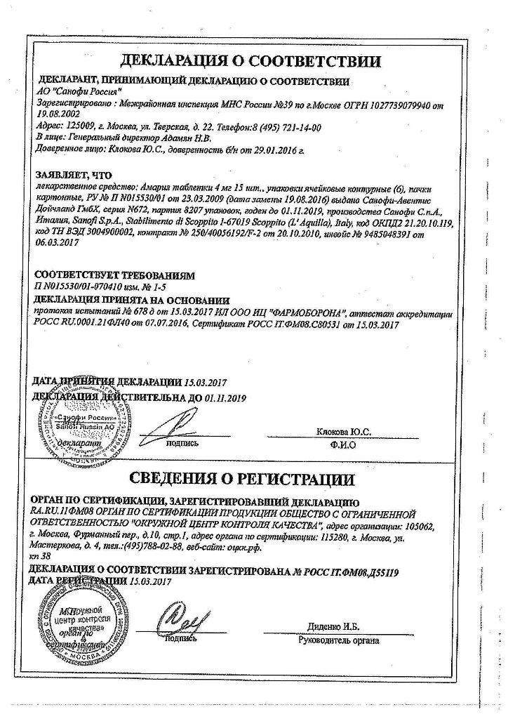 Применение. Амарил принимают внутрь до или во время первого приема пищи. Дозировка Амарила зависит от состояния здоровья пациента и уровня глюкозы в крови и моче. На начальном этапе приема препарата используется 1 таблетка, т.е. 1 мг Амарила в сутки. Максимальная суточная доза, которую может принимать человек, составляет 6 мг.