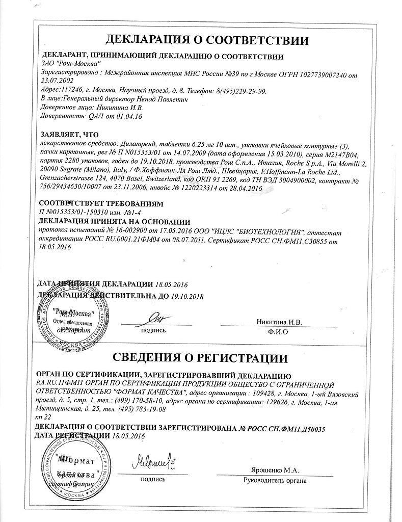 Противопоказания. Ограничениями к приему таблеток Дилатренд являются: нестабильная и/или декомпенсированная сердечная недостаточность, клинически симптоматическая печеночная недостаточность, атриовентрикулярная блокада второй или третьей степени, синдром слабости синусового узла, тяжелая гипотензия, кардиогенный шок, метаболический ацидоз, феохромоцитома.
